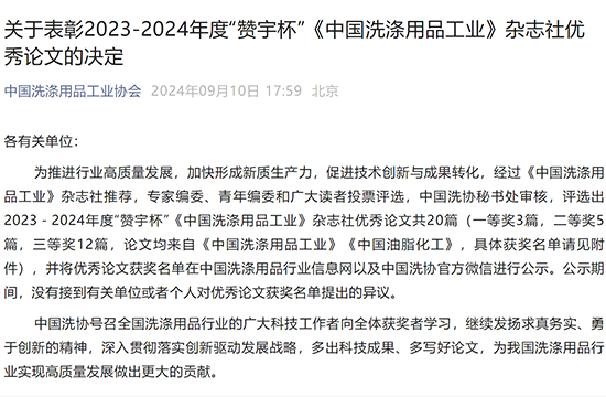 關于(yu)表彰2023-2024年(nian)度“贊宇杯”《中(zhong)國(guo)洗滌用(yong)品(pin)工(gong)業》雜志(zhì)社(she))優(you)秀論文(wén)的(de)決定...